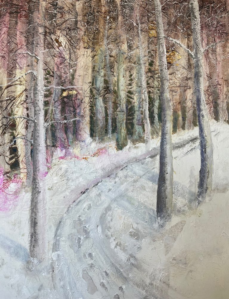 I believe in painting what I know and love and there is nothing more satisfying to me than creating the memory of my time in the mountains. I am always looking for that special shape of a tree, or the undergrowth or it could even be a color or design that attracts me. I can visualize the painting and with the aid of photos I can bring that image back to my studio and use it as a starting point for a new painting. Its an emotional thing that you feel about your subject not a determination to get everything present in the photo into the painting. I enjoy playing with color and values and allow myself to just go by instinct when selecting the palette for any given painting. My work is very wet when I begin applying a variety of color. I must paint flat so that the color remains on the canvas. I experimented for many years on how to add texture to my canvas and have developed a recognizable style. I hunt for shapes as the paint begins to dry and then break many rules of painting to reach my final stroke.